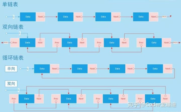 - 双向循环链表 [Double Circular Linked List] : 由各个内存结构通过指针 Next 和指针 Prev 链接在一起组成,每一个内存结构都存在前驱内存结构和后继内存结构,内存结构由数据域、Prev 指针域和 Next 指针域组成。
