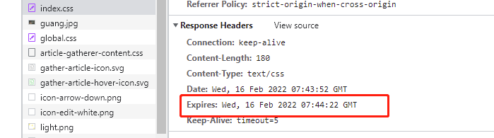 然后在前端页面刷新,我们可以看到请求的资源的响应头里多了一个 expires 的字段