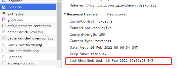 - 第一次请求资源时,服务端会把所请求的资源的最后一次修改时间当成响应头中