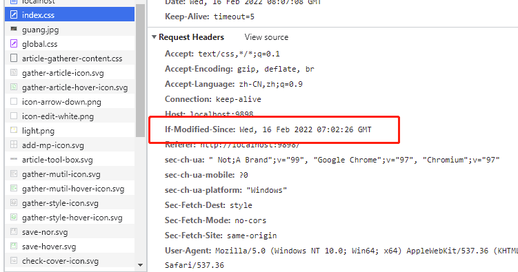 Last-Modified的值发到浏览器并在浏览器存起来 - 第二次请求资源时,浏览器会把刚刚存储的时间当成请求头中